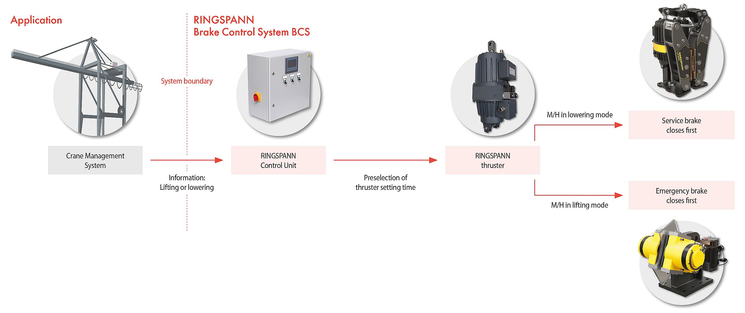 In both cases, the adaptive braking system from RINGSPANN protects the transmission, bearing and steel structure from stress and prevents their premature wear. It consists of four components and allows the braking force to be specifically adjusted: an absolute rotary encoder attached to the bearing of the rope drum provides information about the current boom position via crane management. A control unit picks up the signal from the encoder and switches different valve states in the hydraulic power unit of the emergency stop brakes based on it. By combining special locking valves, the hydraulic power unit enables both immediate braking and braking with initially reduced, then increasing starting braking force. In conjunction with the hydraulic power unit and control unit, one or more emergency stopping brakes finally initiate a braking process with different braking forces. What all three RINGSPANN technology solutions have in common is that they can be adapted to the customer’s needs and always dock directly onto the crane’s management system. ms
